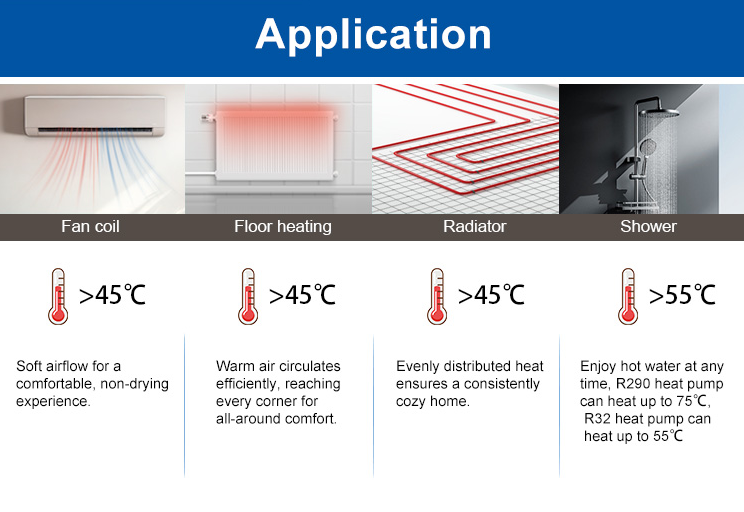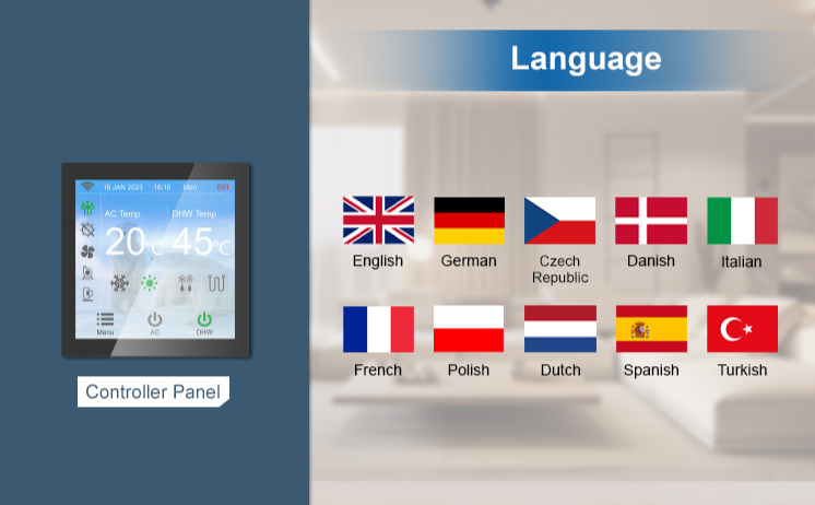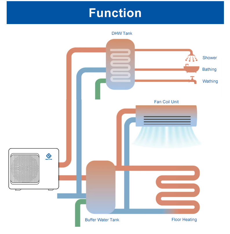 Integra aquecimento/arrefecimento/água quente sanitária (AQS) + aquecedor embutido de 3KW e tanque de expansão para confiabilidade em qualquer clima.