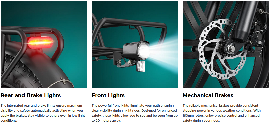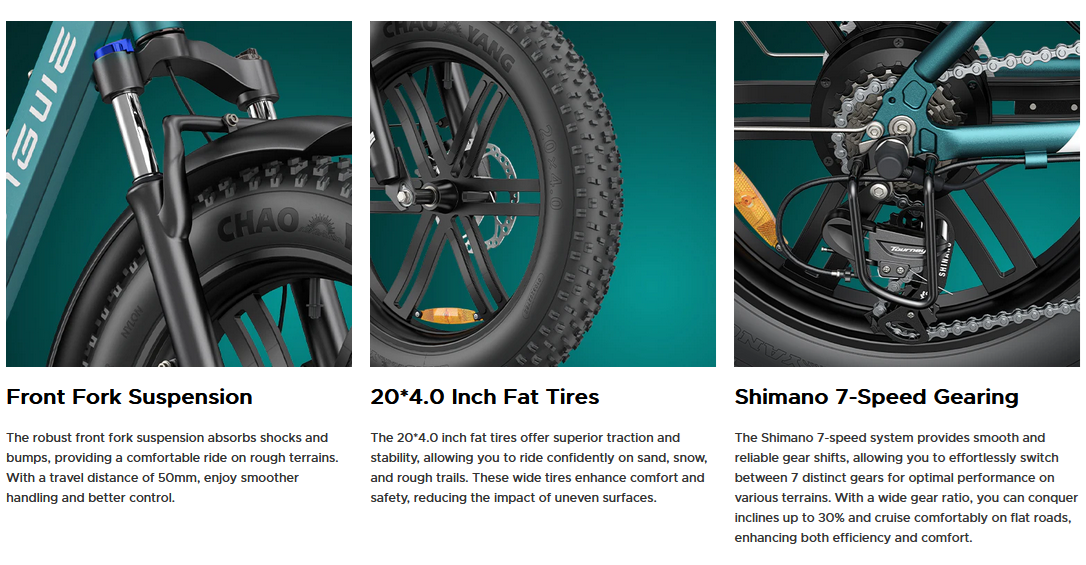 Pneus: 20" x 4.0 Fat – estáveis em qualquer piso (alcatrão, terra ou calçada).