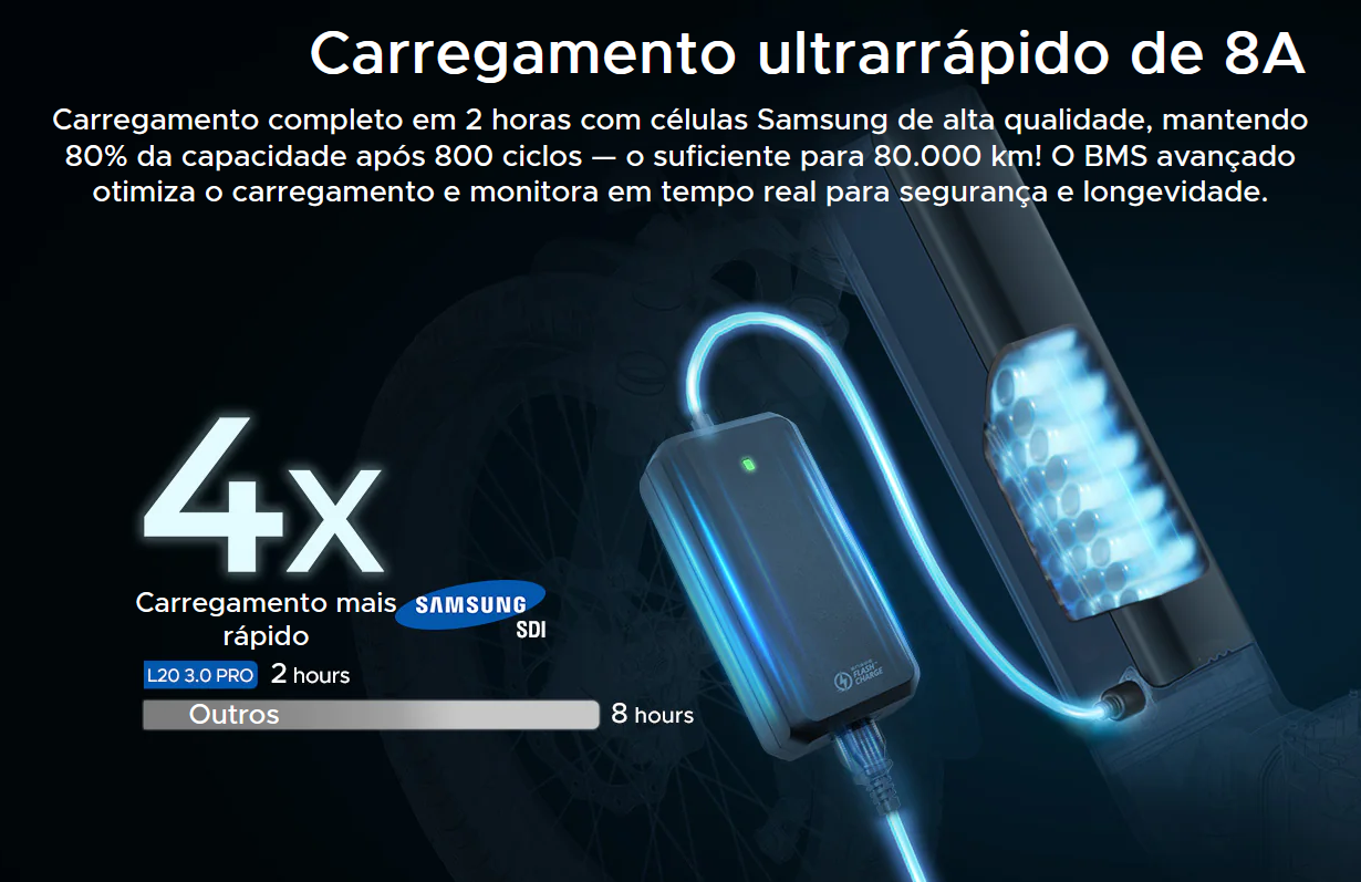 Carregador rápido: 54,6V 8A (recarga eficiente)