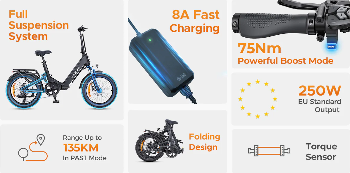 Bicicleta elétrica Engwe L20 3.0 Boost, compacta com suspensão total e potência Boost de 250 W e 75 Nm.