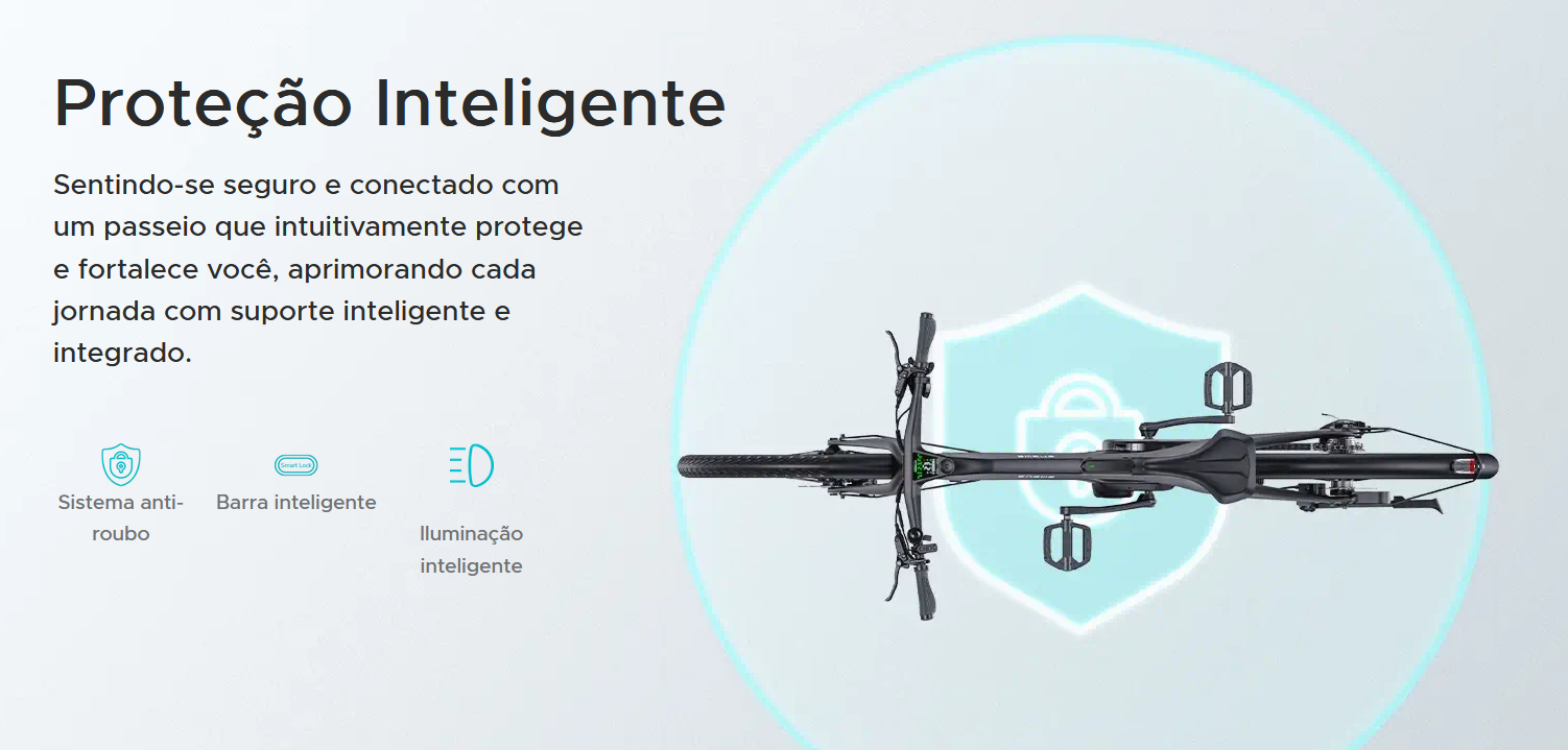 Observações Os valores de peso podem variar em 3–5%. A autonomia real depende do modo de uso, terreno e condições climáticas. Projetada para deslocamento urbano e trilhas leves, com baixa manutenção. Ideal para quem busca: ✔ Mobilidade ágil e sustentável ✔ Conforto e segurança em subidas ✔ Tecnologia integrada (motor, sensores e iluminação solar)