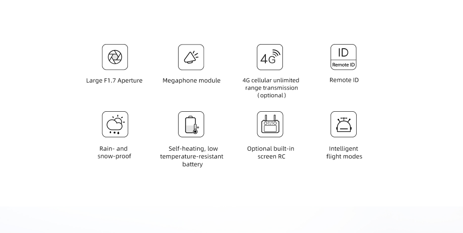Detecção de obstáculo tridirecional, cardan de 3 eixos, transmissão infinita 4G, modo de rastreamento inteligente, filmagem de cena super noturna, RemoteID, à prova de chuva e neve.