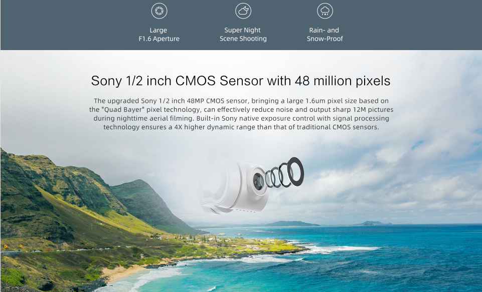 ● Sony 1/2 "48MP CMOS Sensor: O sensor CMOS Sony 1/2" atualizado, trazendo um grande tamanho de pixel 1.6um baseado na tecnologia de pixels "Quad Bayer", pode efetivamente reduzir o ruído durante a filmagem aérea noturna.