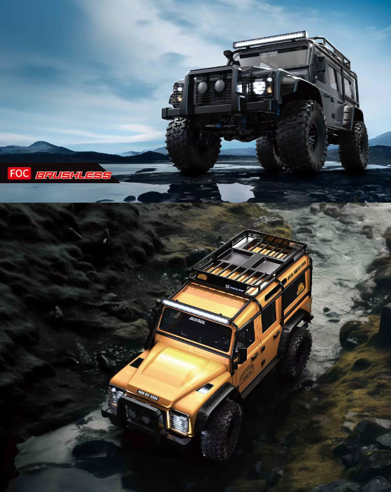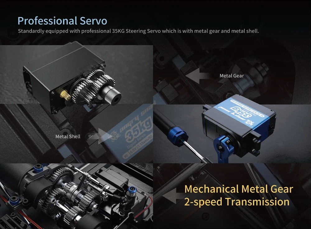 O controlo de direção é auxiliado por um servo de direção de 35KG, transmissão totalmente metálica, diferenciais bloqueáveis à frente e atrás, engrenagens de alta/baixa velocidade e um sistema exclusivo de controlo vetorial FOC que proporciona um controlo absoluto do sistema de motor sem escovas com sensor magnético codificado. Totalmente compatível com baterias LiPo de 7,4 V 2S e 11,1 V 3S com bandejas de bateria frontal e traseira.