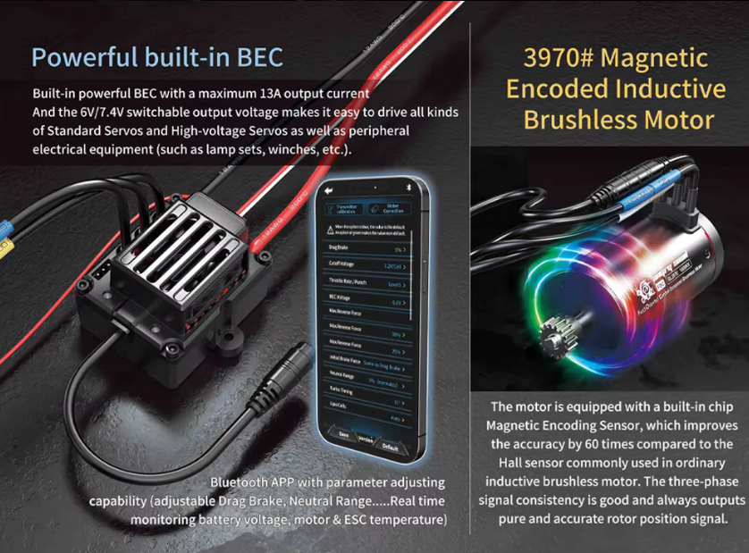 Com a conectividade da aplicação Bluetooth, o ajuste dos parâmetros em tempo real tornou-se ainda mais fácil, desde o ajuste da taxa de aceleração/punção, do travão de arrasto, da faixa neutra, bem como da monitorização da bateria em tempo real e das temperaturas do motor e ESC.