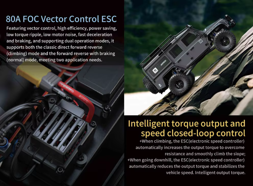 Quer esteja a subir ou a descer, o ESC aumentará automaticamente o binário de saída para superar qualquer resistência e ajudará a mover-se suavemente ao longo da encosta ou reduzirá o binário para estabilizar a velocidade do veículo para uma descida perfeita.
