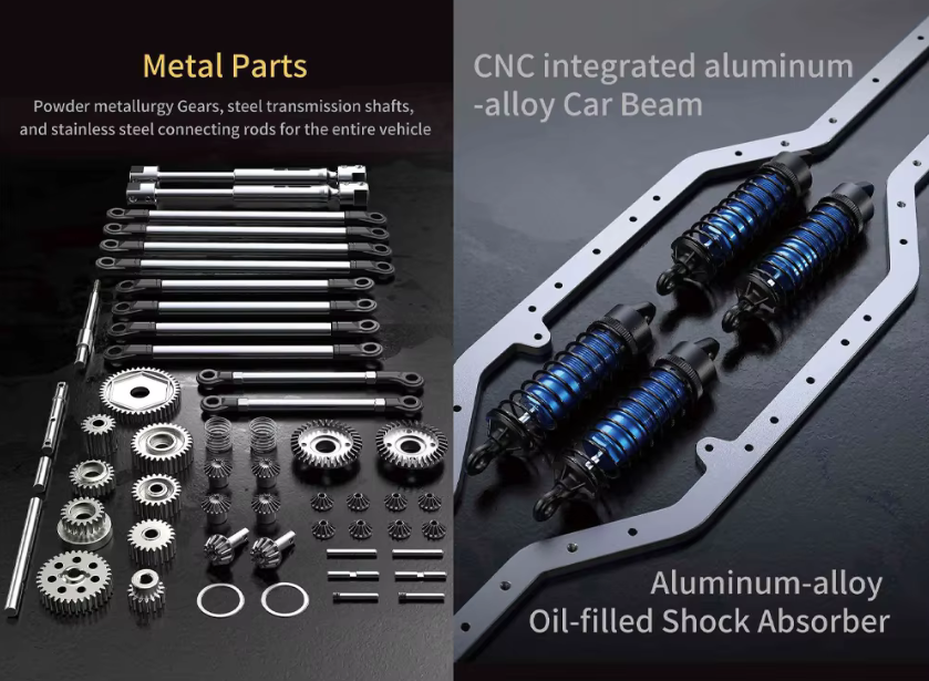 As engrenagens de aço, os eixos de transmissão de aço e as bielas de aço inoxidável são instaladas em todo o veículo com vigas de liga de alumínio integradas maquinadas em CNC e amortecedores cheios de óleo para lidar com qualquer obstáculo.