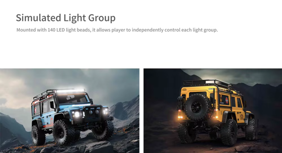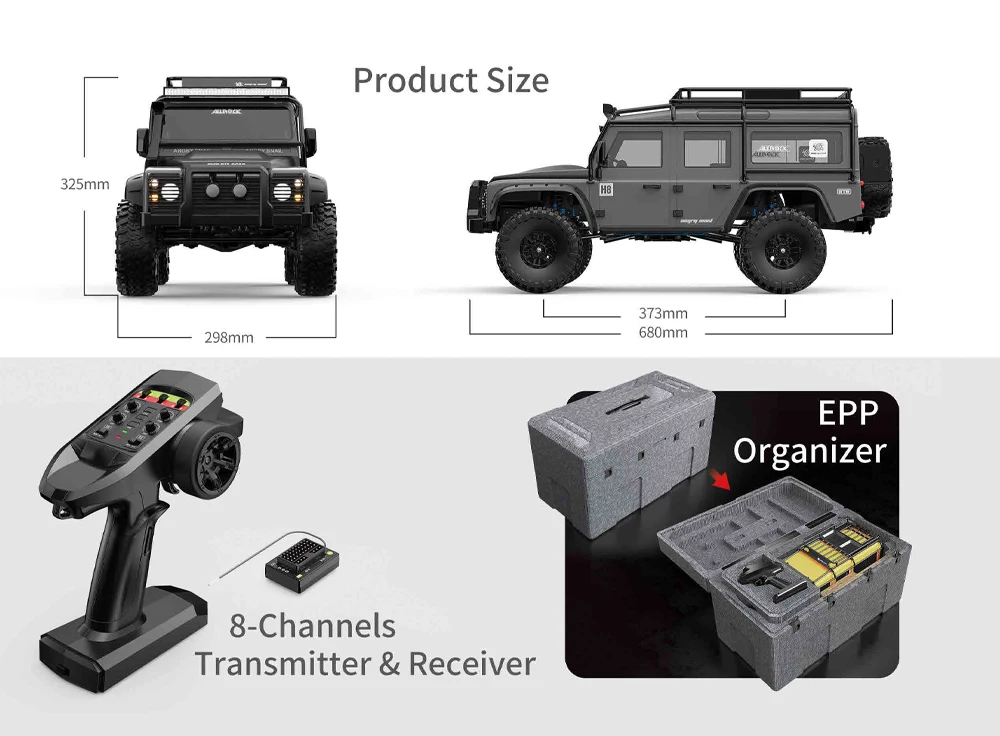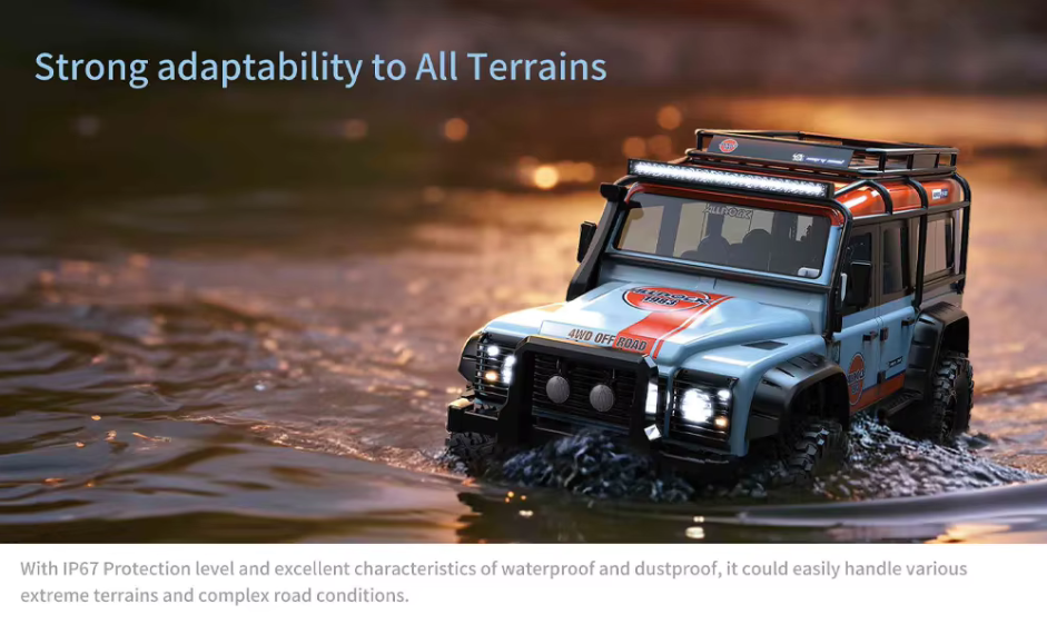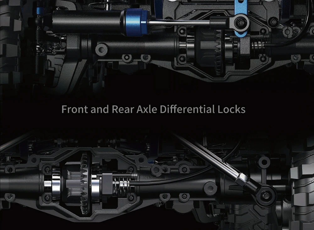 Com uma classificação IP67 para proteção contra pó e água, pode jogar o quanto quiser. o ALL ROCK conta ainda com um servo profissional equipado de série e avaliado em 35 kg, servo de direção com engrenagem e caixa metálica, uma transmissão mecânica de 2 velocidades com engrenagem metálica, bem como bloqueio do diferencial do eixo dianteiro e traseiro.