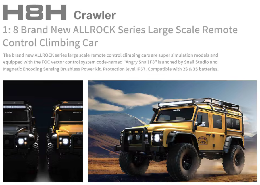 O novo Carro de rasto/escalada RC de grande escala ALL ROCK da MJX. Comercializado como um carro de escalada, o MJX H8H é o único que pode dominar tanto rastejamentos a baixa velocidade como perseguições a alta velocidade (27.35 Kmh +) com bastante potência disponível para cavalinhos a pedido.