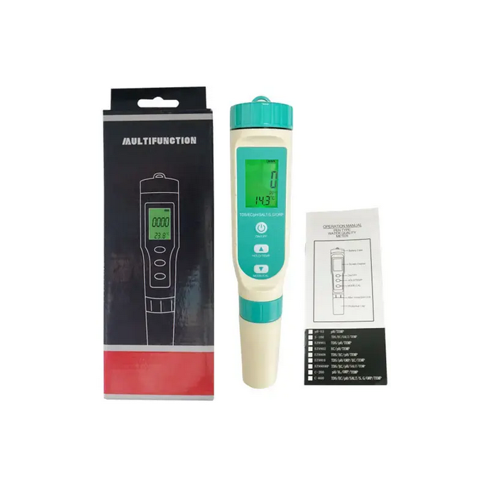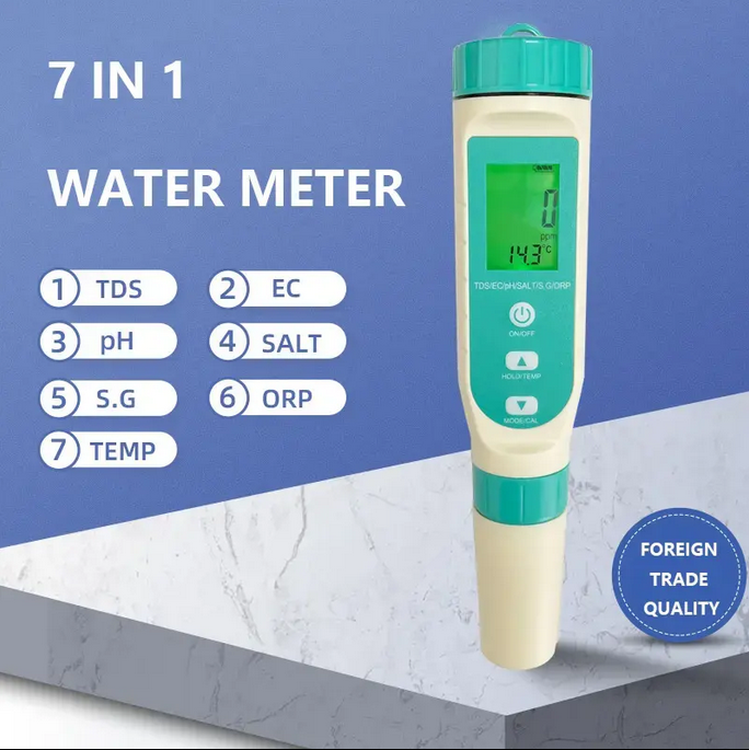 Material: Abs Tamanho: 10*5 Nome do produto: Analisador 7 em 1 medidor de análise da qualidade de água Faixa de ph: 0.0-14.0ph Aplicações: Piscina, água, líquido, hidroponia, laboratório, aquário, etc Compensação de temperatura: 0-60.0 °c/32 °-140.0 °f Fonte de alimentação: 3x1.5v Lr44 Ecrã: LCD Ec: 0-400ms Salinidade: 0-200ppt/0-25% Sg: 1.000-1.222 Precisão PH: ± 0,1 Cor: Verde